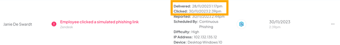 Delivered time is when the email reached the employees inbox, Clicked is when the employee clicked on a link in the email.